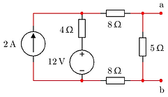 Beispiel 3-7 zum Thévenin-Theorem. Dieses Beispiel ist wegen der abhängigen Quelle schwierig; ein Ansatz kann sein, am Ausgang eine konstante Stromquelle mit 1A anzuschließen und die Spannung zu berechnen.